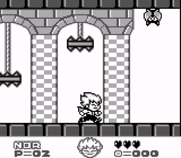 The worst part about all of that is Kid Dracula is a mostly really good game. Right from the start, you can use the “change into a bat” ability, and you get the walk-on-the-ceiling power-up early too. Instead of large stages, Kid Dracula is mostly broken-up into bite-size chunks, complete with an animation when you reach the end of one. Many levels and set pieces from the original game also return. The extended “bullet train” roller coaster sequence is back. The ship is back. The vertical jumping sequence up a narrow tube is back. The speed, jumping and movement physics from the Famicom game are mostly intact. Many bosses return too. This is probably 55% – 60% remake. However, there’s enough surprises for people who already played the first game to not get bored replaying the same stages and bosses in the black & white version. Hell, the first boss had a gag that made me literally laugh out loud. Don’t worry, I won’t spoil it.