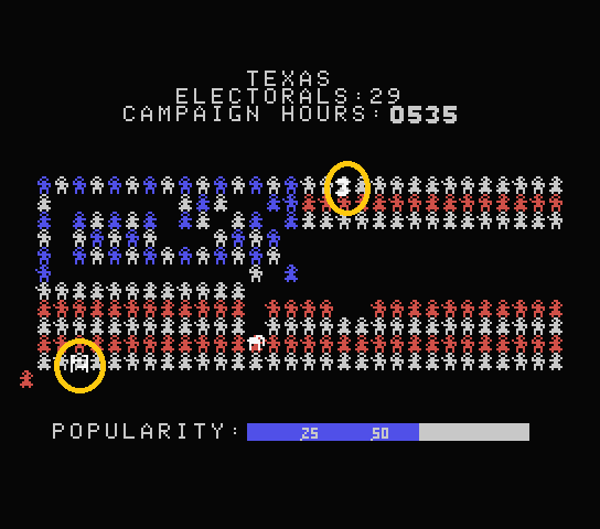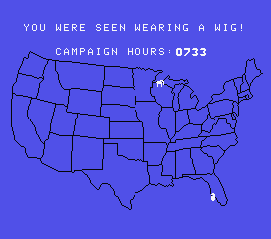 Well, my campaign is going.. swimmingly. Which doesn’t mean I’m drowning, despite what the spin on Reddit says. FAKE NEWS! Besides, I literally inherited Fort Knox and sold it for scrap, which somehow added 30 campaign hours and almost certain federal indictment. Gas up the campaign plane and find me a country without extradition, just in case. Preferably one with a better form of government than this. It’s just clumsily moving along state borders while mashing the fire button and hoping I find the right spot. That’s literally how you campaign in Campaign ’84. You have to walk around the edge until you find that state’s invisible “entry point” but you also have to press the FIRE button, which sadly doesn’t fire my campaign manager. Most entry points were at the top of the state, but not all of them were. There’s also no Alaska and Hawaii, and it’s hard to squeeze into the rinky-dinky states.