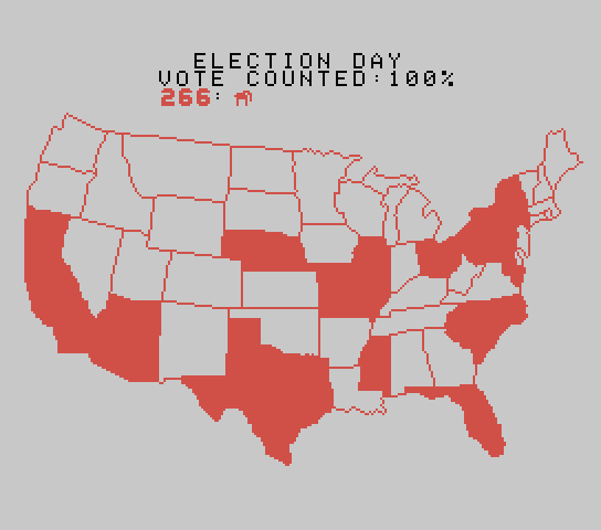 This really is the ONLY campaigning you do. And, once you get fifty percent of a state, you want to deliberately maroon yourself onto a single voter. Once someone is run over, you can’t move to that same spot again, at least until the next campaign out of respect for the breathless supporters who sacrificed themselves to my campaign. It’s sort of like reverse Snake. It’s actually harder than it sounds too, because you can move diagonally, and you can’t leave a state until you have no moves left to make. I screwed myself over multiple times by leaving diagonal moves, and every second counts. But, if you collect the right issues, they give you an automatic popularity boost. Just two should put you over 50% for that state, which is enough, and that goes a LOT faster than scooping voters one at a time. Also, Stars & Stripes Forever plays during this whole thing, and it’s intolerable. Thank god the campaign season is almost over. This is boring. Well, here was my.. genius campaign manager’s brilliant electoral strategy. Remember, I need half the electoral votes +1 to become President of the United States. 270. If it’s 269, horseshoes are thrown until a winner emerges.