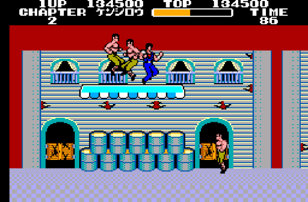 Easily the hardest level is the second. It’s because the jars take half your life. So do the snakes, which somehow do as much or more damage than fire breathing dragons. The moths in level four also take half your life bar, but you see them coming, and they have very predictable patterns. I legitimately beat that part on my first try (oddly enough, I also beat the 4th and 5th bosses on my first attempt as well). The second level’s jars can drop on you in the same spot back-to-back, with not enough warning to avoid them. Since they take half a life bar, two jars, or a snake then a jar, if my math checks out is, you know, death! So the pitch-perfect scaling of the coin-op is lost in translation, and that badly hurts Kung Fu Master. A ROM hack that balances the damage would probably tilt this into the YES! column. Maybe. Hell, it took me a dozen or so non-cheating games just to reach the first boss thanks to the timing issues. I discovered a nifty trick that helped me out. I found making progress impossible until I started ignoring the knife throwers who were behind me. That ended any timing issues of being attacked by grippers from both sides and, all by itself, cut the difficulty in half. When they do attack from both sides, there’s often so many enemies that even making the screen scroll a step forward is a chore.