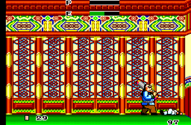 OOMPH is the term I use to describe video game violence having the look, sound, and feel of real weight, velocity, impact, and gravity. With that said, Kung-Fu Master’s OOMPH is unlike any other game’s OOMPH. It’s very subtle, but it works so well because of the pitch-perfect death sprites of the enemies, which fall off the screen in a swooping, “out cold” type of way. Spot on, and one of the best death animations of the 80s.