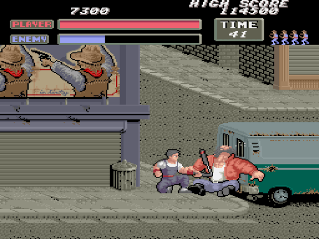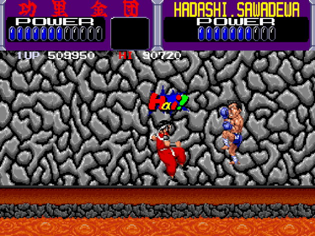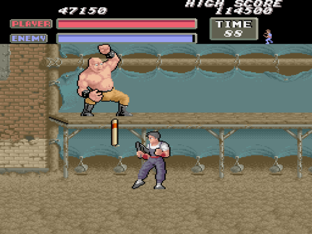 From the studio that eventually birthed the Raiden shmup franchise comes this horrible wannabe. Instead of scrolling towards a goal, you’re placed into an arena where the object is to defeat X amount of enemies. It uses the same basic concept as Spartan X: a punch and a kick, both of which can be done while jumping or kneeling. Interestingly, holding the attack buttons causes you to hold the attack outward. Interesting in the sense that it’s different. There’s no point to it. I mean, it doesn’t really do damage and leaves you open to attack, plus you look silly doing it. Like you’ve just sh*t yourself and decided in the moment if don’t move, nobody will notice. On the other hand, Knuckle Joe (no relation to the Kirby character) could do a slam dunk from the NBA three point line from how far he can jump. And hey, this is the first game in this feature where you can block, which is done by holding both jump and kick at the same time. So, it seems like everything is here for a decent game. Well, except the combat is a wet fart. Oh, maybe I was onto something with the holding attack.