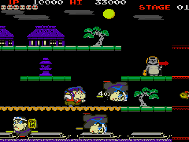 Okay, so, this recommendation from my unofficial-official curator Dave Sanders really doesn’t belong in a Kung-Fu Master feature in terms of gameplay. I’ll buy that the theme was inspired by the success of Kung-Fu Master and the ultra-satisfying kicks from that game. BUT, Shao-Lin’s Road’s connection to Spartan X stops at the theme and attack. It actually shares much more DNA with something like the original arcade Mario Bros. It’s a wave-based platform game where the object is to eliminate all the enemies with well-timed kicks. The basic enemies take a single kick to knock out. “Bosses” for lack of a better term (the stage doesn’t end when you beat them) take four kicks. When you defeat a green enemy, it throws out limited-use items like fireballs, deadly shields, and spiked balls. Besides the items, it’s all kicks, all the time. You have to press UP to jump high enough to reach the next platform while the jump button is really only effective for jump kicks or to jump across gaps. If you walk off the ledge of a platform instead of jumping, fall onto your head, and lose one of three hits that reset every stage. And, that’s pretty much the whole game.
