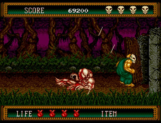 I think with Splatterhouse a lot of the appeal was the massive sprites and schlocky horror, considering that I think it’s good that it still stands up pretty well as a game. I like Splatterhouse 2 even though it suffers a bit from the Megadrive’s comparatively weedy sound (although the upcoming unofficial port of Splatterhouse 1 for the machine seems to sort this); part of what I like about Splatterhouse is the sound fx which add loads to the atmosphere. There’s also a nice mod which fixes the rubbish “skull” mask and restores the original hockey mask from the arcade as well as tweaks the colours a bit.