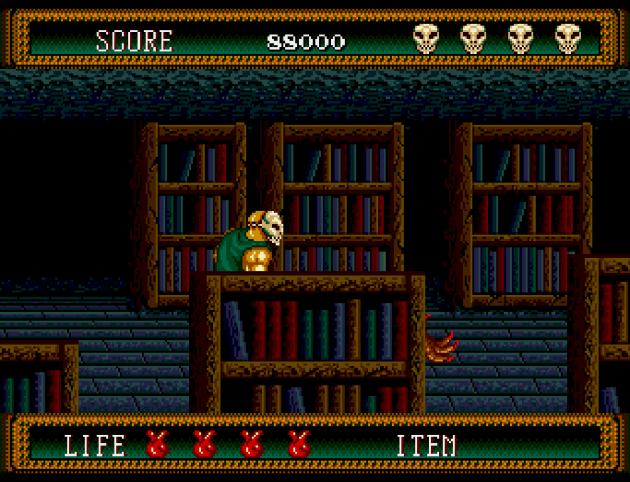 The basic enemies are a bore. The bosses are a REAL bore. There’s not a single memorable design in any of them except the second boss, which is pictured above. Even that kind of sucks, because it’s fought in a black void, like the Genesis version of Altered Beast. I get why it’s like that. A boss that big has to remove the background or the Genesis can’t do it, but it also makes it hard for me to get emotionally invested in the setting. Also, unlike Altered Beast, Splatterhouse relies heavily on the setting for the chills. You can’t just take that away. The setting is the whole crux of the game! Of course, for the most part, this feels like the setting is the same as well. The two locations that feel new-ish, the library and the portal, both fail. The portal has you falling down a shaft, but your character’s walking animation stays the same. It looks incredibly silly.