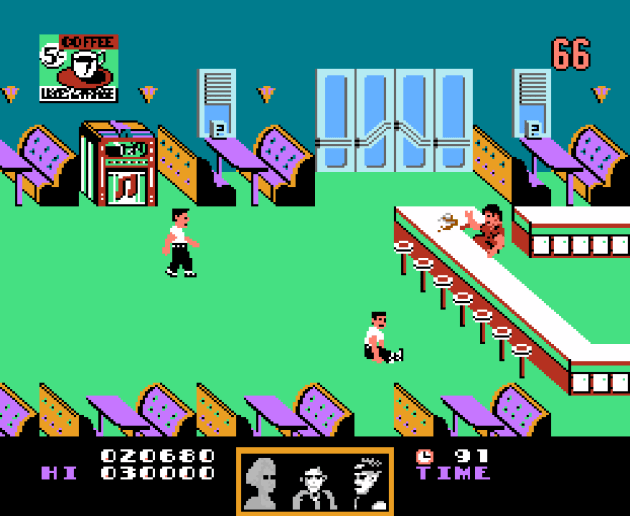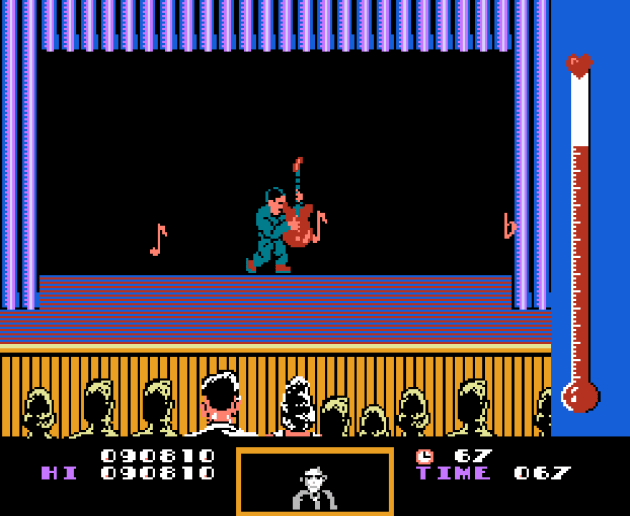 The worst of the levels is the Johnny B. Goode scene, where you hold a guitar up and down to catch music notes. The difficulty spike of this section is pretty bonkers. During my play session with Back to the Future, I only died once on any of the road scenes. They’re fairly easy to clock and, once you have the bowling ball, it’s not really THAT hard to avoid touching enemies. But, I wouldn’t have passed the guitar segment (or the cafe scene, for that matter) without cheating. The notes just come flying in too quickly, and the amount of memorization required was too much for me to handle. Thank God for save states. By the way, I had a giggle when I realized using save states alone made this more of a Back to the Future experience than any of the gameplay did.