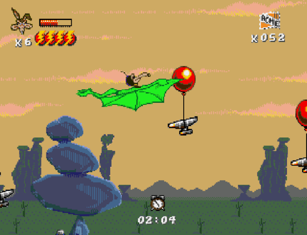 The tightrope helmet pulley, where you actually do have to balance back and forth while you slide down the rope. I’ve seen this type of thing in games before, but because you’re upside down, it’s never been done quite as immersive. And this is why being able to catch the Road Runner so easily especially hurts, because this type of thing totally fits the cartoon franchise. If not for the fact that they already completely ruined the connection, this would be the thing that puts it over-the-top as one of the best uses of a slapstick license ever, helped along by some of the funniest animation sprites in any 16-bit game. Seriously, the Coyote’s sprites are FANTASTIC! Genuinely laugh-out-loud hilarious. Even funnier is that I’ve never been impressed with Blue Sky Software. I think Vectorman is lame. I think the Genesis Little Mermaid game is incredibly boring. I can’t believe there’s Blue Sky fans, because I just don’t think they’re very good at making games. Remember, these guys were owned by Titus. F*cking Titus! They were a joke when *I* was a kid. They’re the Superman 64 people! Blues Brothers 2000! This is a bad lineage, but this game? Desert Demolition? It’s fan-f*cking-tastic! How come nobody talks about this one? It’s wonderful!