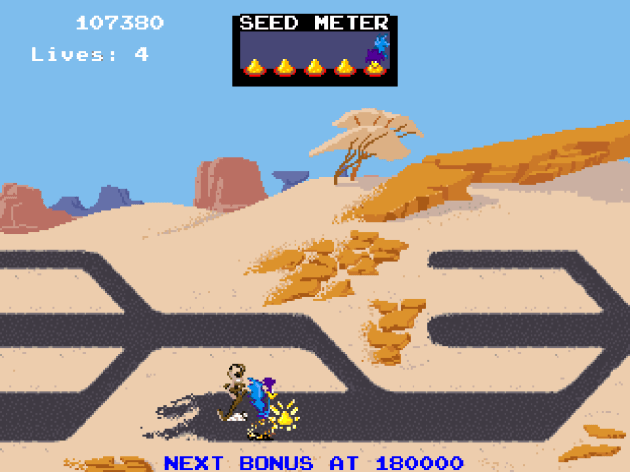 The smaller collision box on the seeds, in theory at least, seems like a solid game plan. If you miss one and want to keep your score perfect, you have to run backward and risk getting caught by the coyote. Sound logic, right? But, it all hinges on the coyote being an exciting antagonist, and he’s just not. It would have been far more exciting to make the bird seed easier to pick up via bigger collision boxes and lean more heavily into having the world’s fastest-paced maze chase. This should have been to that genre what Sonic The Hedgehog was to the platformer. I mean, why not? So, how sensitive are we talking, here? The shot on the left is to show you how small the pile of bird seed is, and the shot on the right is me standing literally on top of it, in a way where my sprite is blocking the seed but you can clearly see I’m not collecting it.