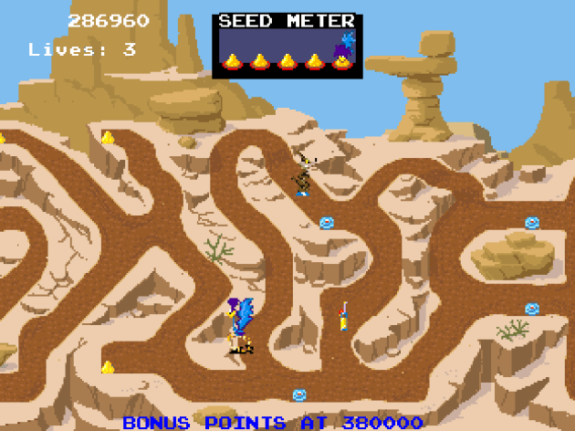 Screw that. If you want to give players loose controls and wide roads to navigate, being that strict with the seed is asking too much. This is every bit as bad as one of those brawlers where the main challenge comes from lining up on the exact right plane of existence as the enemies. I hate those, and I hate this. Instead of being that anal about it, presumably all for the sake of making players double back and put themselves in harm’s way, they could have made the seeds easier to collect and simply added more environmental hazards so that the coyote remains an ever-present threat, but not the MAIN threat. There’s a potentially great game buried in this crap, but the way they have Road Runner now, it makes me wish they had just shamelessly copied Pac-Man and set the game in an actual walled-off maze. To hell with suing ACME. The movie should have been Coyote vs. Atari Games.
