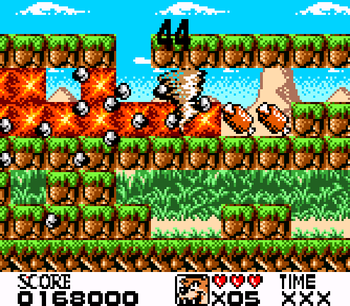 Level four is basically a no-fail bonus stage where you have a minute to get as much meat as you can with the Tasmanian Devil. It’s not very good, as it’s too easy to get stuck at the top of the screen. The whole idea behind this bonus stage made more sense in the original black & white Game Boy game. In the Color version, each level has a bonus stage attached to the end, making a mid-game solo bonus stage redundant and a massive waste of time.