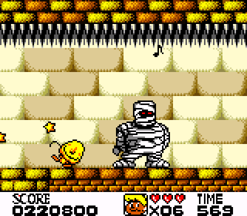 The second stage has you playing as Tweety. This is an avoider-style platformer where you’re simply trying to avoid Sylvester. Having just played one of the best avoiders I’ve experienced, ironically a Road Runner game for the Genesis, this really doesn’t cut it thanks to the lack of variety. You just repeat the same tiny handful of obstacles for several agonizing minutes (it feels longer), while the strategy to avoid the cat remains the same: just zig-zag. You don’t die if he catches you, instead only losing a single heart (and there’s plenty of refills). There’s also a variety of open sewers that the cat will blindly run into, and it’s not very hard to trick him into doing so: just stay low. This was completely brainless and one of the worst second stages I’ve ever played.