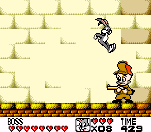 The final stage with Bugs Bunny plays identically to Daffy’s stage, frisbee and all. The problem is that this level leans very heavily into two things: a cramped screen and mini-boss battles. The cramped screen problem is tied to the bad collision. Looney Tunes is counting on you taking damage from not being able to scratch out a safe attack distance from the enemies. After some mild platforming bits, you rematch with every mini-boss (except the shmup one) that appeared up to this point, plus a new one. Then, you have to avoid a boulder in an extended sprinting sequence that had one idea that ran out of both tension and fun long before the level ended, then there’s a final battle with Elmer. This ended when I caught him in a collision cycle and basically could let go of the controller and still win the game.