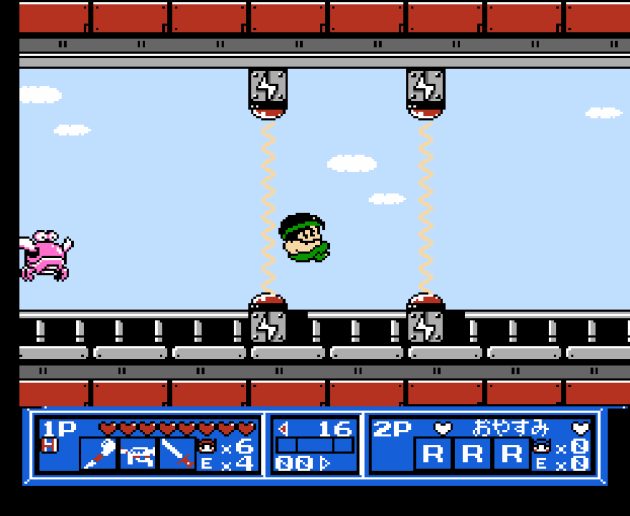 But even if you do take damage while wearing one of the all-stars, there’s so many power-ups that start that meter. Even if you’re already wearing an all-star, you can start the meter going by grabbing an item, wait for the count down to get low, and activate it for the same character again. By the end of Wai Wai 2, the game is giving you the items for that meter seemingly every screen, allowing you, in essence, unlimited invincibility. On top of that, there’s “health boxes” which reset the timer to 60 seconds. Someone got paid for this idea, and someone else got paid to say “good idea!” to that person, and someone else got paid even more to agree with the second person and green light the first person’s idea.