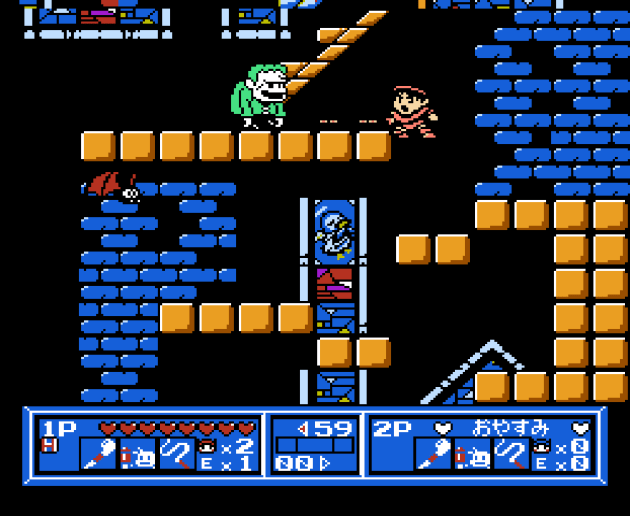 That is a screenshot from the slowest and most boring auto-scrolling stage in the entire history of video games. LOOK HOW SLOW IT SCROLLS! Who the hell play tested this? Did they think it was exciting? Did they think this was fun? Now, the stages where you actually do the scrolling aren’t the worst levels in game history, but they are very boring. The designers seem to have overcorrected the difficulty problem of the first Wai Wai World, because this sequel is completely toothless. I never died once during the platforming segments, even though I was braining myself on the spikes in the slow-moving swimming stage above. Besides one boss fight, I don’t think I ever had more than one or two hearts worth of damage. I can’t imagine playing this co-op, because it sure seems like one of the two players is going to have nothing to do for all but one level. There’s not enough meat in these levels for one player, let alone two.