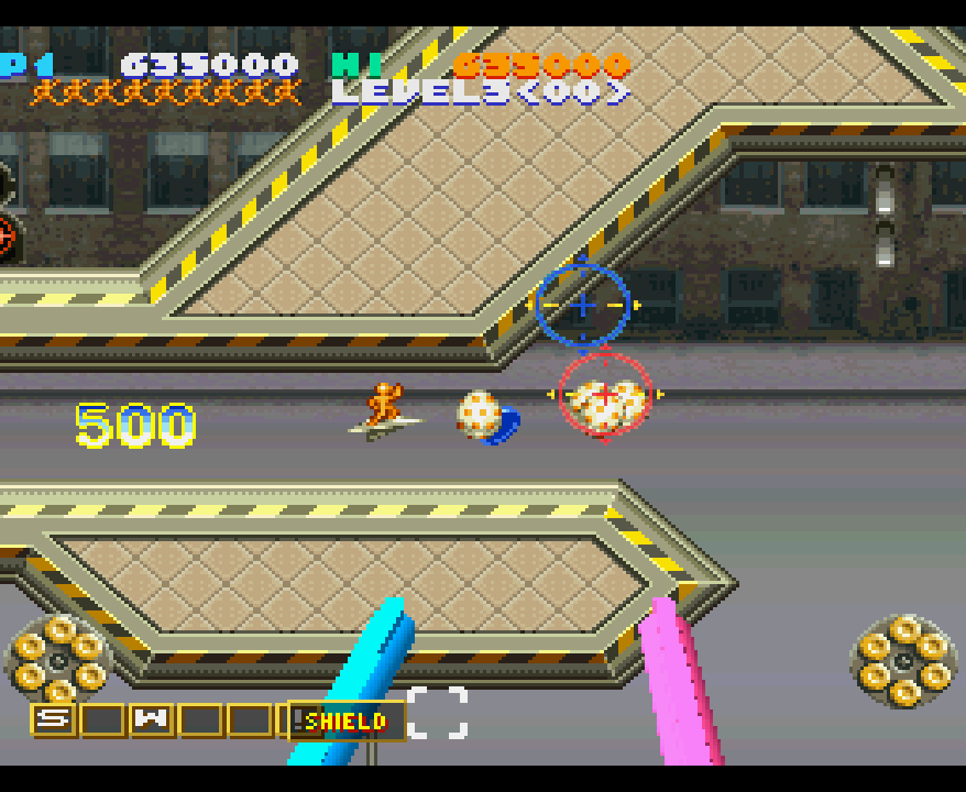 In the Lethal Enforcers level, a new addition is two virtual players are taking aim at you for a good chunk of the level. You simply have to avoid their crosshairs. This was not in the SNES version.