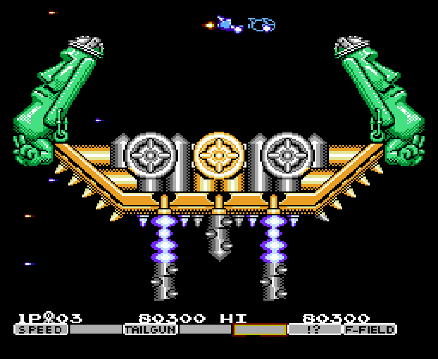 Here’s the last NES-exclusive boss: a Moai viking ship. It’s actually sort of a cross between the traditional Moai battle and a giant avoider-sequence.