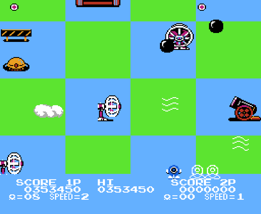 This is actually the fifth level, and once again, we’re back to a boring green/blue backdrop, only with even less details to the terrain. A green/blue checkerboard. What were they thinking?