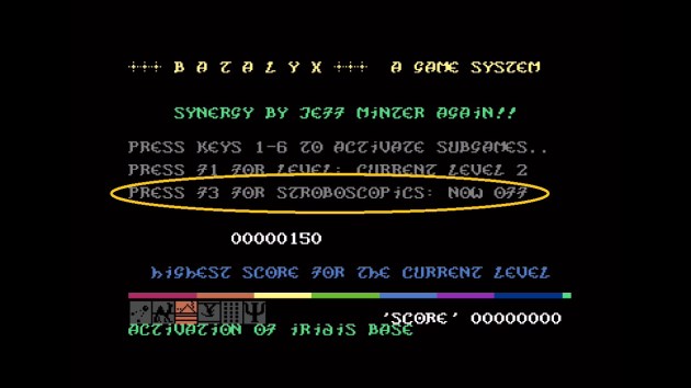 The problem is that they promise to warn players which games are bad with an icon. It’s a BIG problem for reasons I’ll explain. For readers finding me for the first time, I have epilepsy and I’m photosensitive. So warnings like these potentially help me a lot. Ironically, 2025 marked the 20th anniversary of my first seizure, which you can read about here. I don’t speak the King’s English, by the way. I’m from California. I think that’s the literal opposite of British, but I did that feature with Epilepsy Action in the UK and they ran my editorial through a filter that, among other things, turned the word “mom” into “mum.” Now my mom insists on being called “mum” and I hate you people for it. 🖕HATE!!🖕 But either way, I was SO excited that Digital Eclipse included that icon. Except, they couldn’t have bungled it worse. You see, only two games in the entire collection are marked with that icon. It’s the two light synthesizer games Psychedelia and Colourspace. Needless to say, there’s many, many more games that have strobe effects that aren’t marked. One in particular, a collection of six mini-games called Batalyx, has a built in “strobe” toggle that was there in the 1980s that implies it removes the strobe effects:
