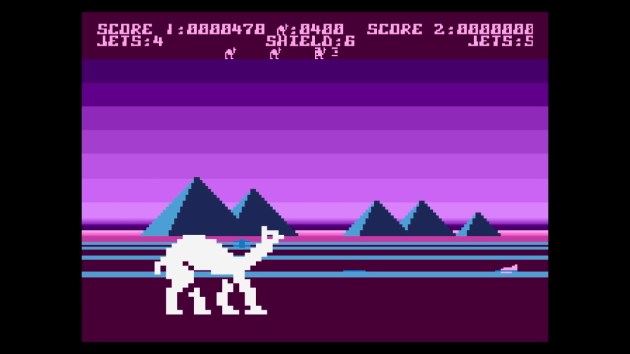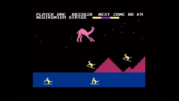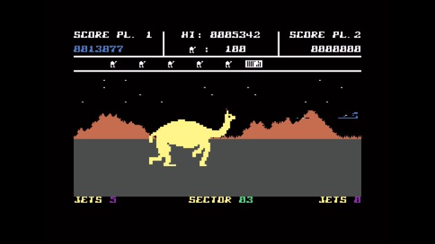 Holy smokes! I like a Mutant Camel game! This is a BIG improvement over the original Revenge of the Mutant Camels. Movement is still stiff, but it’s not as sluggish as it was. Most importantly, you move faster and the enemy attack patterns are much more elegant. This is what I think he wanted Revenge 1 to be and it wasn’t. Plus, you’re not stuck to the ground with only a heavy jump at your disposal. This time, the camel can fly. It’s a little awkward to get the hang of, but after a few minutes I was able to bob-and-weave around enemies, and the eight-way shooting is more responsive too. Don’t get me wrong: this isn’t exactly Konami SHMUP levels of satisfying. But it’s still a vast upgrade, and there’s even more.