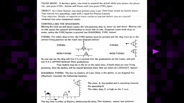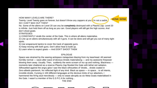 Llamasoft: The Jeff Minter Story features some pretty damn complex games paired with some of the most useless instruction books I’ve seen. Okay, so the plots contained within those books are cute and wacky and I enjoyed them well enough. But instruction books should, you know, teach you how to play a game. Gaming is a visual medium, but most instruction books in this set are text only. Frankly, I don’t think that’s acceptable for any video game that isn’t a 100% sound-based game. But plain text explanations of some of these games really isn’t enough. No screenshots. No context. Just words to explain games like Mama Llama or Iridis Alpha. I had to look up YouTube videos of people who understood how to play these games, and when I did, I noticed those videos tended to have a lot of comments along the lines of “I’ve had this game for thirty years and I never understood it until now! Thank you!” If people who are home computer game fans couldn’t figure these games out in literal decades, why the hell would you rely on only them for any generation of gamers? It’s either cruel or lazy. Take your pick. Here’s the Mama Llama instruction book: