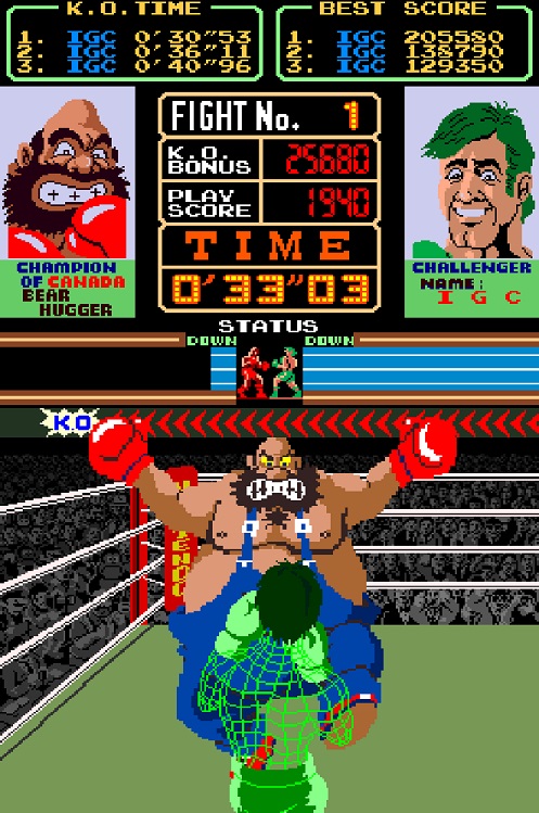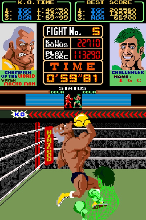 If the first game was a prototype for better things to come, Super Punch-Out!! is the game that confirms Nintendo recognized that and had ideas for how to get there. Punch-Out!! should be about everything but boxing. If it feels like you’re obeying the Marquess of Queensberry Rules, well, it’s kind of boring, isn’t it? Here’s where it gets really weird: I couldn’t wait to be done with the first coin-op. The second game added something to the upper screen: K.O. Time, IE how long you need to knock a boxer out. This added SO MUCH replay value. I was still frustrated by the controls, but nowhere near to the degree I was the first time around. When I knocked out the unfortunately named Vodka Drunkenski in 44 seconds and change, I literally let out a cheer. The time trials also clued me in that I wasn’t fighting Dragon Chan right, as even on my fifth fight against him I failed to put up a good time.