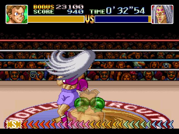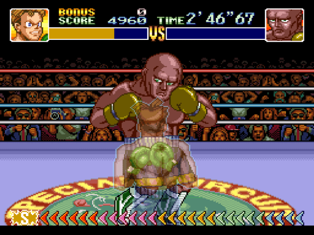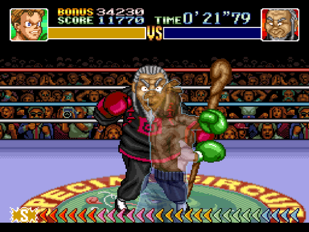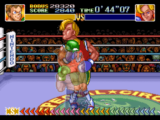 Don’t get me wrong. Super Punch-Out!! does a lot right. I marveled over how convincing the palette swaps were in the NES game, but somehow I never noticed that the SNES game does the same thing for all but two characters as well. I mean, of course I realized Bear Hugger and Mad Clown used the same body, and the Bruiser Bros. needed no explanation, but I swear to God it wasn’t until I played today that I realized everyone else but Narcis Prince and Hoy Quarlow share a body with someone else. The pairings are Gabby Jay & Bob Charlie, Piston Hurricane & Aran Ryan, Bald Bull & Mr. Sandman (and they did in the original coin-op as well, duh), Dragon Chan & Heike Kagero, and Masked Muscle & Super Macho Man. I’ve played this for years and I never realized that and now I feel stupid. But, to my credit, none of the fights feel like palette swaps. The Dragon Chan and Heike Kagero fights couldn’t be more different. This has to be right up there with the ninjas in Mortal Kombat in the palette swap hall of fame.