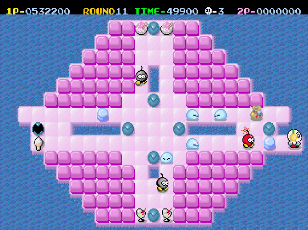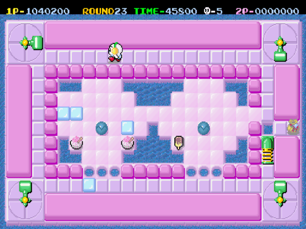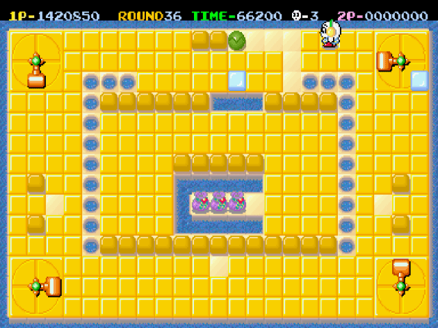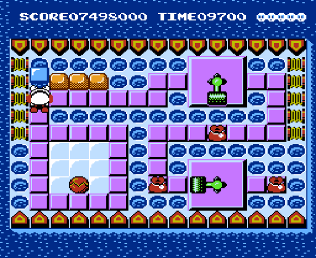 The weird thing is, you’d expect the coin-op to have a bigger variety of enemies and the NES game to have a tighter focus on the puzzles themselves, but actually it’s the opposite. The clowns, turtles, cannons, and guys invincible snowmen that also have freeze breath from the NES game are not here. There’s also a couple more levels that are based around what I call “intercepting” puzzles than in the NES game, probably thanks to the bigger playfield size. This was as hard as the game gets. The idea is that the place you need to create a bridge is completely inaccessible with walls or pillars, so you have to cause two ice cubes to collide from opposite directions to line them up with the spot where you can create the bridge. Getting the timing down, even when they’re usually generous with the size of the area where a bridge can be made, is tricky.