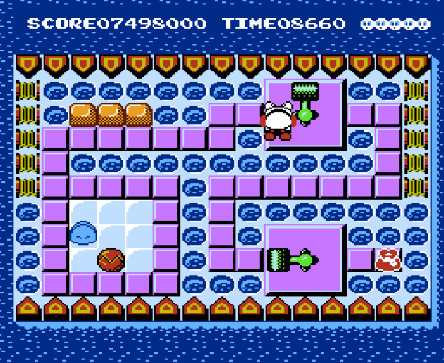 In that level, the chickens create a timing-based gauntlet for you to run. There’s a fast-moving spike at the end of the path that’s trapped by an ice block, but the ice blocks will eventually melt if you don’t keep them frozen with your breath. It’s the timer within a timer because if you take too much time, the block will melt and the spike will kill you. Okay, levels like this don’t really fit in with the puzzle theme and are probably a feeble attempt to drain lives since the level up to this point haven’t exactly been challenging. Here’s another stage like, where once you shove the block, you have to run the full circumference of the playfield before the hammers hit the ice cube back into you.