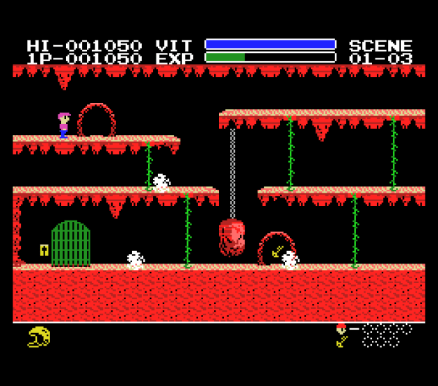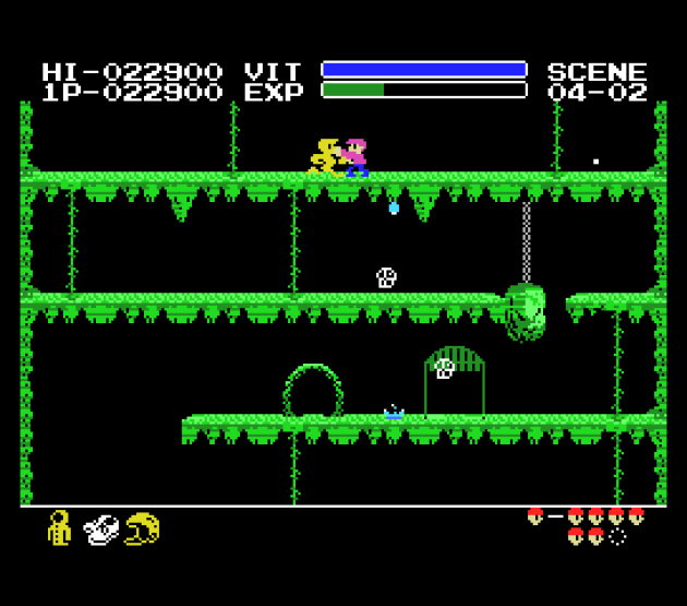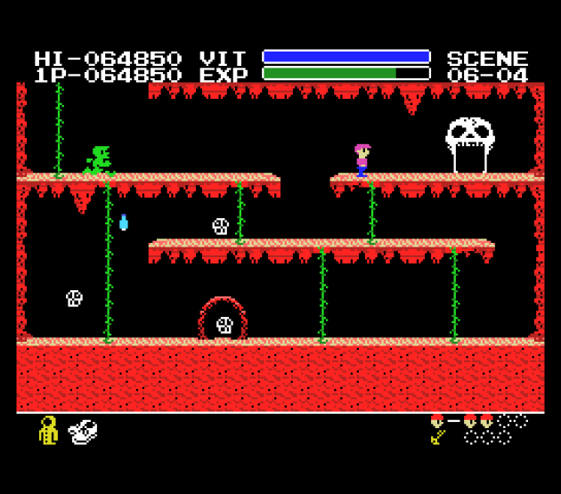 Notice that giant skull in the above pic? It’ll swap you around to different areas of each level. Every screen is marked with a different “scene” number which is confusing and unhelpful. Thankfully the different areas in each stage are short, making backtracking as non-annoying as I’ve ever seen in any game. The numbering of the scenes might throw you off at first. The first door you encounter in a level could jump you a few scenes ahead of where you would expect to be, but you can always go backwards if you need to. Fans of drawing your own maps will probably really dig this one, and it’s a cinch thanks to the MSX’s limitation that prevents scrolling.
