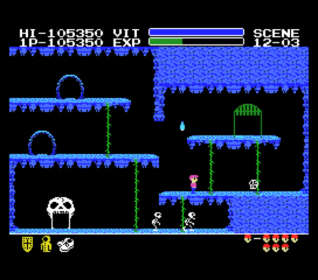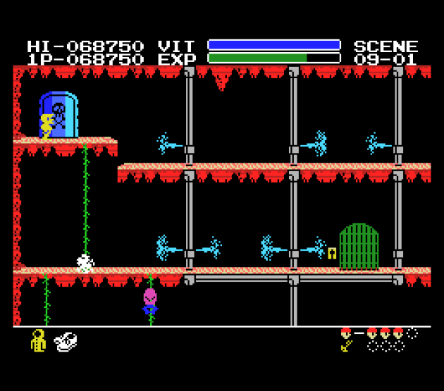 The Goonies on MSX is just a lite-on-frills platformer set in a maze. The game is divided into five levels and the object is to collect all seven Goonies in each level and then find an exit. The Goonies are behind locked doors, but keys are just lying around. You don’t have to kill a single enemy to collect one. There’s no bombing doors like in the Famicom version. The catch is you can only hold one key at a time, but that’s not a problem at all. There’s A LOT more keys than there are locked doors. Maybe too many, actually. Even on the fifth and final level there’s literally caches of keys that went almost entirely unused. However, not every locked door has a Goonie. Some will have potions that restore your health, while others might rarely trigger the hidden items. Worst case is a door might be double-locked, but I never had to travel too far to get the second key. The final door on each level is marked with a skull and crossbones, but once you have the seventh Goonie, just return to it and walk through it to beat the level. There’s no bosses, so really this is just a search for the Goonies.