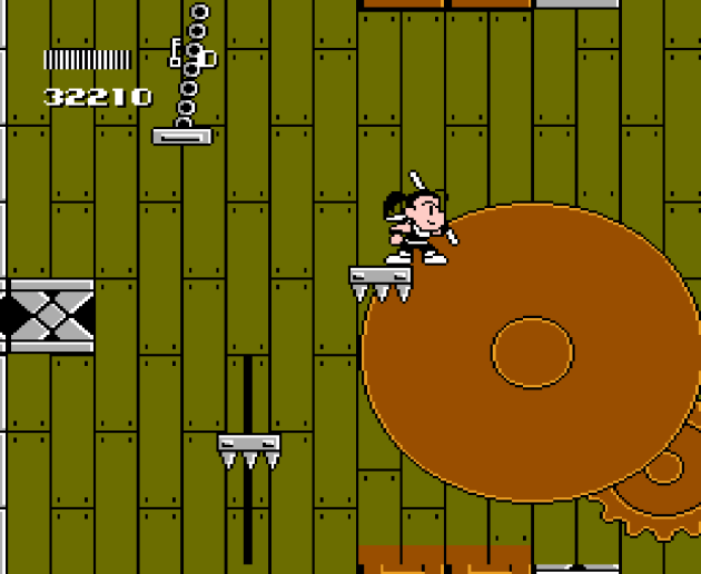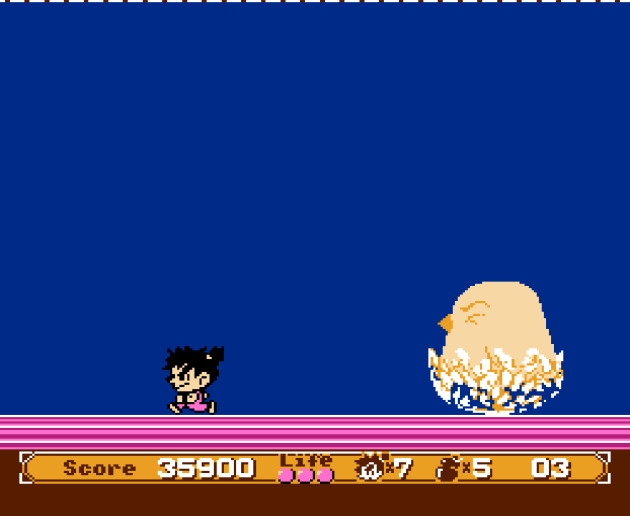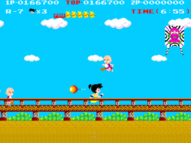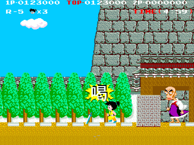 You’ll notice Twirly’s hairdos aren’t the same in every pic. For screenshots of the coin-op, if he’s got messy hair culminating in a rat tail, like in this picture, the screenshot is of the US version. If he’s got a topknot (a “Chonmage” in Japan) it’s the Japanese version. The other major change is the Japanese original has no checkpoints. If you die, you have to start the level all over. Since a couple of the bosses are brutal, that’s too big a punishment. None of the differences are present in the Famicom/NES game.
