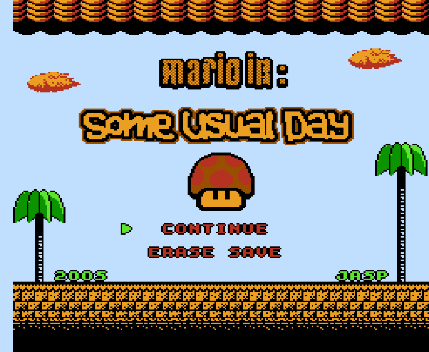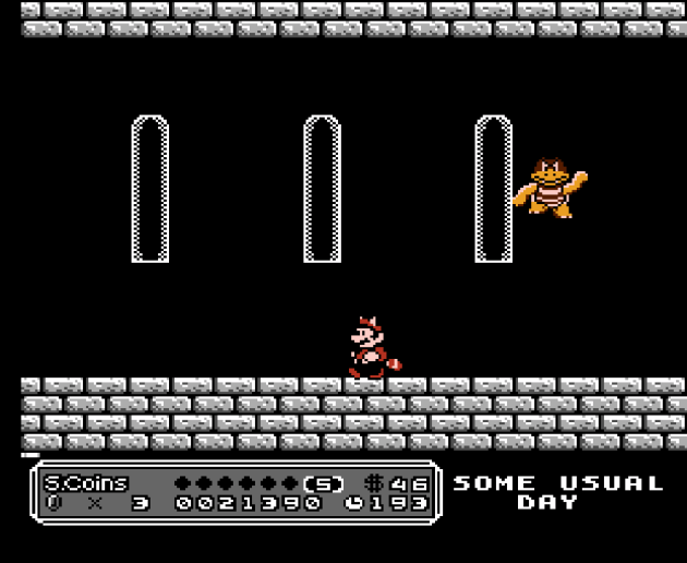 Some Usual Day is a solid, enjoyable, professional-quality take on Mario 3. It’s, more or less, like a more by-the-books expansion of Super Mario Bros. 3, with several twists. There’s special coins in the stages, though I’m not even sure if I figured out what they’re for. There’s only four game worlds, but the effort at making the levels be a joy to play is clear. Give me four worlds that are never boring over eight hit-and-miss ones any day of the week. It does manage to bring some fun twists, too. The Fire Flower stacks with other suits, so you can fly through the air as Racoon Mario and carpet-bomb enemies with fireballs, or be Frog Fire Mario (SO HELPFUL in many stages, to the point that I realize how much the real Mario 3 should have had this be a thing). Even funnier, you can have the firepower when you’re little Mario. It’s always good for a laugh.