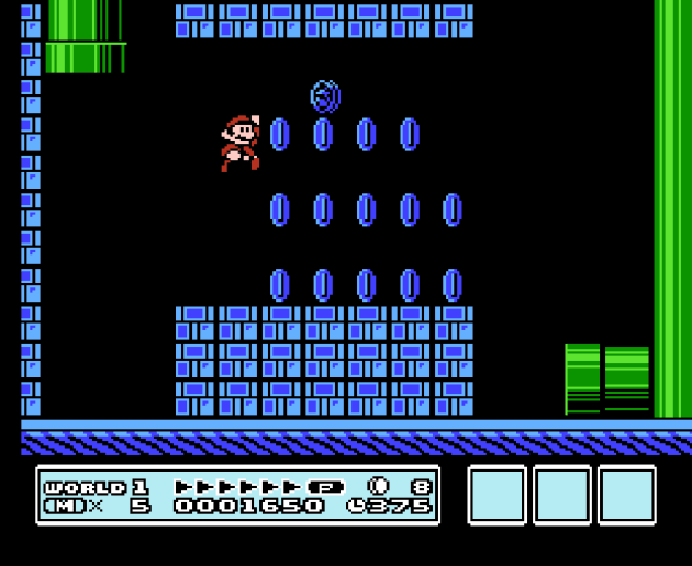 Instead of an axe at the end of the bridge, it’s a P-Switch, which is a lot more Mario-ish than an axe anyway so I’ll allow it. But, as impressive as it is that a convincing version of the Bowser battles from Mario 1 are here in a game built with Mario 3’s engine, it’s also a stark reminder how far boss battles have come in the four decades since. Fighting Bowser in Mario 1 is just not fun. Period.