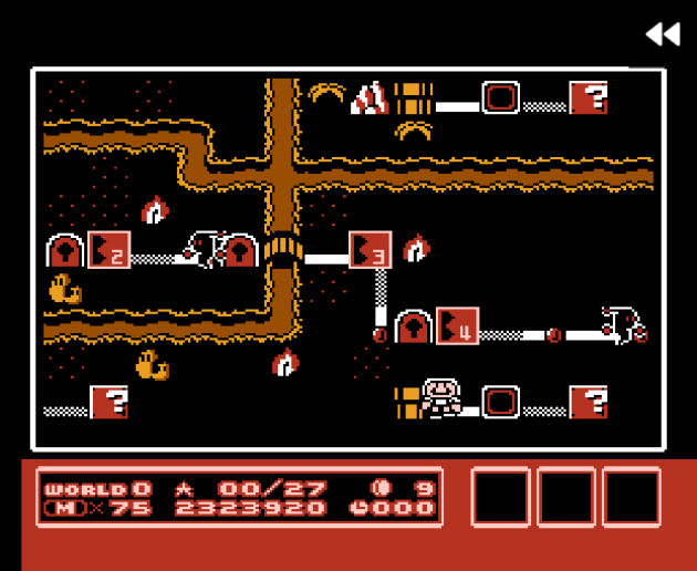 Some major changes: Fire Mario can jump super high (like Luigi in Mario 2), fireballs you spit travel in a straight line instead of hopping along the ground (but can curve around blocks) and there’s no lives. Instead of 1up Mushrooms, you get 50 coin mushrooms. Using the toad houses costs 300 coins, while the match-the-symbols roulette costs 100 coins and rewards you with items.