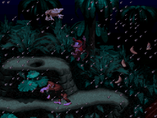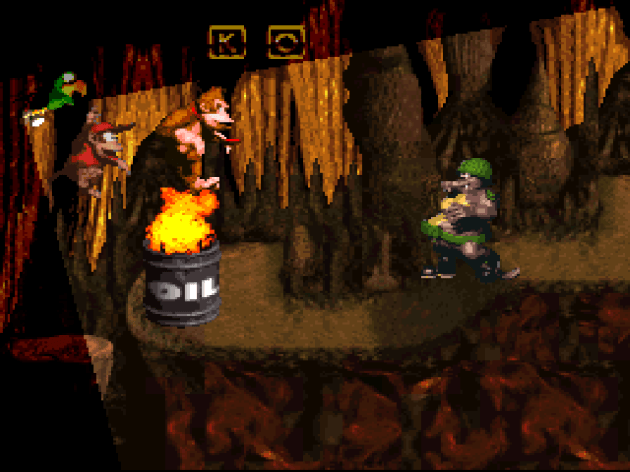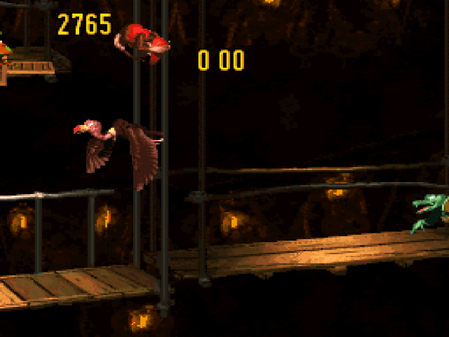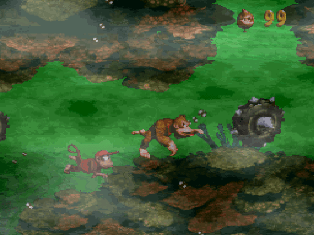 Even the Stampers recognized the game was too easy, but I think that could have been fixed by adding a difficulty toggle. A hard mode wouldn’t have been too hard. Just remove a lot of the DK barrels from stages. I took plenty of damage playing DKC, but I never had to wait more than a few seconds to undo that, so there was no tension. Still, the addition of Diddy Kong was probably the smartest move. What Donkey Kong Country really does right is removing hit points in favor of having two different characters, and whoever you’re playing as is lost when you get hit, at least until you find the next DK barrel two seconds later. Being able to swap between two characters who have different skills was also inspired. Diddy Kong can cartwheel through enemies and seems to have more hangtime when you cartwheel off a ledge before he has to jump. Plus he carries barrels in front of him, which makes it easier to uncover hidden doors. Meanwhile, with Donkey Kong you can do such tactics as tagging Diddy so you can use him instead. Again, a great idea that would be utilized better in the sequels. Are you noticing a theme here?