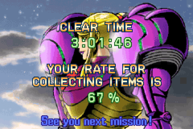 ARE YOU SH*TING ME? How the heck did I miss 33% of the items? I knew I should have used a guide. Oh, and ignore my completion time, because I did rewind and use save states a lot to undo backtracking. At one point, I spent close to an hour trying to figure out how to get one super missile pick-up (this one) when I knew I had the stuff to get it, but I also wanted the best ending. I really thought I’d be further along in my Nintendo marathon, but trying to 100% every game is getting to be a pain, especially since I missed an energy tank in the first Metroid anyway (I didn’t get the one in Kraid’s chamber). For Zero Mission, I really did think I got most everything. I’m genuinely stunned I missed so much. I thought, at worst, I’d have like 90%.