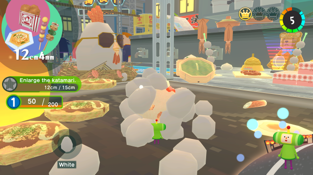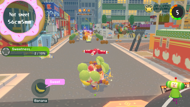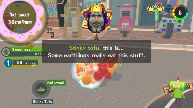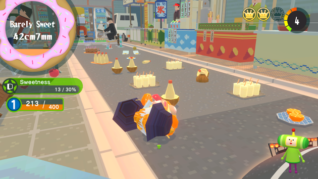 Sadly, it’s not the only “high concept” stinker. New to this game (I think, at least, my brain seems to have deleted all the handheld games from memory) is a level where you have to roll up sweet, sugary food objects and avoid non-sweet foods. Instead of just trying to create a large ball, you’re trying to maximize the sweetness of the ball to 100%. The setting is a vast open air market and food court, and things like plates don’t count towards the objective.