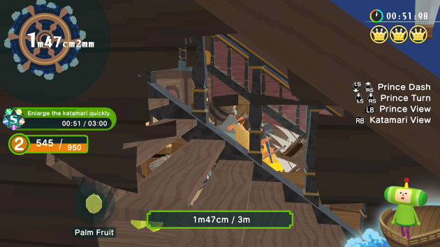 Not every new concept is a dud, though most of the “new” gimmick stages are just reworked versions of old stages. Remember the snowman level? They took the same basic “cover as much of the ground as possible” concept and made it worthwhile by theming a stage around rolling a water ball around a desert. The hook is that you have to continuously dunk the ball in water sources to keep it moist. While it diverges from the core Katamari gameplay and that normally annoys me, it’s fine as a one-off side quest. The racing stage that I loved before returns, only this time it’s a boat race, and it’s just as fun and just as easy. Come to think of it, the whole game is crazy easy. I only failed on one level in my entire week-long play session, and it’s another returning stage: the fireball that you have to build up to light a central end-goal fire, which might be the single worst-designed layout in any Katamari game, and given how lazy that Koosh Ball level is, that’s saying something.