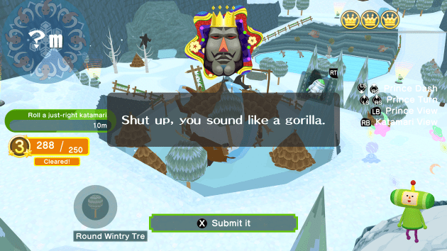 See how much of that sixteen seconds had text blocking the screen? It begs the question, ahem, WHAT THE ACTUAL F*CK IS WRONG WITH YOU DEVELOPERS? Did you not get attention as children? This is about as charming as a clown honking a horn, spritzing water, and pieing people in the face at a mass casualty funeral for stillborn puppies! People have been complaining about this since 2004 and they just keep doubling down on it like it’s the thing that got the game to 2025 and not, you know, the ball and the rolling stuff up part! Like every other Katamari game, the same dialog repeats every single level. Whether you’re rolling up cousins or ninjas or bowling pins, you will see the same dialog block the screen every single goddamned replay, and this in a game that heavily encourages replaying levels. The only exception are the presents since, once you have found them, they don’t return in each replay.Â