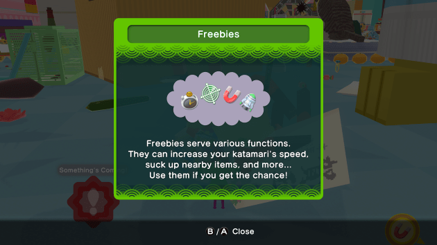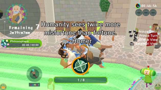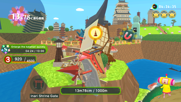 Yeah, I’m really stuck there on basically nothing, and remained stuck long after that clip ended. I have no clue how I did it. Oh sure, the one time it feels like my Katamari doesn’t bang off something I can’t roll up and I become ensnared by it. Maybe it’s just a product of poorly thought-out layouts. While wrapping up this review, I realized only two stages made me sit-up in my chair. In the biggest Katamari game ever. There’s like fifty stages, give or take, and two really stood out. Two. And I had a week to think about that, too. Sigh. The best parts of Once Upon a Katamari are undeniably addictive in that “just one more game” kind of way, but they’re also unmemorable. The best levels are, you know, fine. The magnet is fun and probably the highlight of the game because it added the most value to the experience. There’s also a time-freezing stopwatch that, yes, also stops the timer and adds some much needed strategic flexibility. Though I’m not entirely convinced that the locations of the items were precisely chosen to maximize player options and decision making, the game is better off for having them. The other two items are nowhere near as fun. The rocket just led to a whole lot of banging into things and the radar lasts too long.