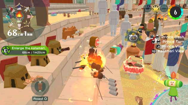 The “light the fire” stage takes place in Roman times and has a coliseum setting. But, they fashioned the layout like a maze, and I don’t mean like a Pac-Man style maze, but an actual “how do I get out of this thing?” maze, only while using the people in the audience as the walls. You have to build up the ball as big as you can and find your way to the center to light a fire. I’m almost certain you won’t ever be able to get big enough to roll people up and the object is to wiggle around the maze. It’s a really boring idea because there’s no room for spontaneity or to really even create your own strategy. It’s too narrow and too railed. It’s a f*cking maze, and Katamari is at its best when you’re in a big, open area where all the corridors are wide. The type of stages that are so vast that it’s overwhelming at first and you have to discover the best path to grow the ball. Also, the thing about mazes is they don’t usually offer replay value once you know the solution. This one is no different. Once you know the routes, the thing that made the stage “special” is over, but unlike other stages, the act of collecting isn’t fun. The pathways are too compact.