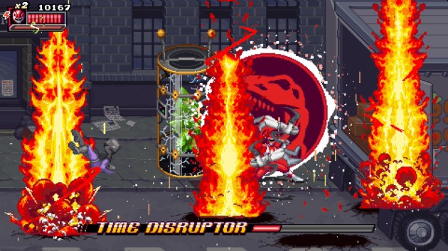 I really did enjoy most aspects of the brawling bosses, which often lean heavily into forcing players into timing-based jumping sequences to avoid their hits. Like here, Turkey Jerk spins around with this laser and it’s like the Sweeper event from Wipeout. I do think some of the attack sequences went too long or had too many invincibility frames but, meh, the brawling bosses are fine. They just never “do it” for me the same way TMNT does.