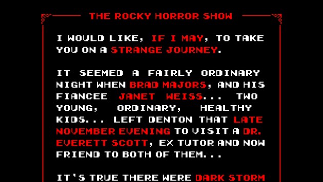 In the interest of full disclosure, I’m friends with Freakzone Games, which is one guy: Sam. Now, I never factor friendships into the verdicts of my reviews, but I figure you should know that I like Sam as a person and as a game maker, in that order. That’s in contrast to the 1975 motion picture The Rocky Horror Picture Show, which I don’t like at all. It bores me, but it’s nothing personal. I just don’t like musicals. I usually don’t watch them unless they involve Disney animation or, more rarely, giant carnivorous plants and evil dentists. Now I’m from a family of cinephiles and the lone hold out in my family for Rocky Horror fandom, so it’s not like I’m unfamiliar with it. Rocky Horror Picture Show for me is in the same boat as other “cult” movies like The Room or Manos: Hands of Fate (ironically another flick that Freakzone adapted) in that I have tried so many times to sit all the way through it and have never come close to finishing the film in a single sitting. It’s not for me, which in theory means the game isn’t for me, right? Well, it’s not that simple. Even if you’re not a fan, I can explain why you’ll want to keep reading with a single screenshot. This one: