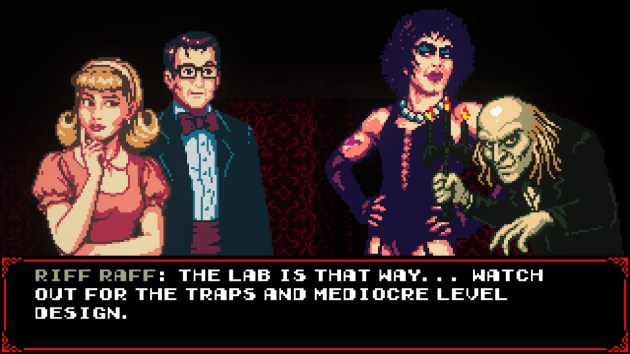 Now any satire like this is ultimately going to devolve into “hey, you know that thing you know about? I too know about that thing you know about and I made reference to it in my thing!” Sam isn’t THAT lazy about it and puts a small little twist on his references, but they are still just references at the end of the day. If you’re someone who laughs at those types of jokes without fail, you’ll probably like Rocky Horror even more than I did. That stuff doesn’t really land with me, but that’s kind of liberating because it allows me to focus on JUST the gameplay. For the Rocky Horror references, my sister Angela, a fan of Rocky Horror, was kind enough to watch me play and, while she had a valid criticism that I’ll get to later, she said that fans of the film will recognize lines, and the timing and delivery of the Rocky Horror-related humor was, more or less, on par with the film. Now whether fans of the film would want to play a punisher-platformer is another matter altogether. Angela was stunned by the genre. She thought the game would resemble something like Undertale, which would lend itself more to the film. “I don’t want to play a hard game where I’ll die a lot. I want a Rocky Horror video game experience. I won’t be able to finish this!”