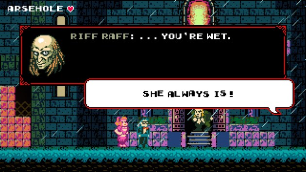 The gameplay is little more than a skeleton for plenty of saucy humor and a satire on classic gaming at large. Yep, like his (fantastic) Angry Video Game Nerd games (has it really already been four years since I reviewed those?), Sam used Rocky Horror to poke those precious, precious memberberries with a stick. The Rocky Horror Show Video Game is overflowing with gags and direct homages on video games and game design. It apparently even kind of takes shots at the culture surrounding the Rocky Horror film. Sometimes it’s really subtle. I’m tone deaf so take this with a grain of salt, but I could swear I heard a tiny riff from the soundtrack of the Capcom NES classic Chip ‘n Dale: Rescue Rangers at one point.