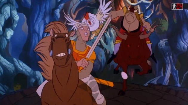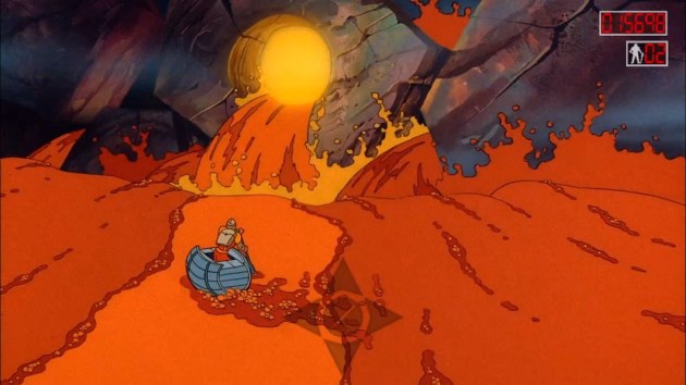 The most obvious problem with Dragon’s Lair II: Time Warp is that it really doesn’t make any effort at all to feel like a video game. In Dragon’s Lair, the game randomized all but the first and last levels of the game. It worked there because they were all short and they all flowed seamlessly into each-other. Time Warp’s nine levels are longer, linear, and with the exception of the first level, have no checkpoints at all. They’re also all, more or less, self-contained animated shorts that don’t fit-in with each-other. The moments where it feels like they were trying to animate some form of a video game trope in order to invoke the expectations of what a game should be like are few and far between. In Dragon’s Lair or Space Ace, whether you were swinging across ropes, timing when to move between spikes, leaping across platforms, or fighting monsters, the designers created the illusion that you were controlling Dirk and Dexter (well, until they forgot to do that in Space Ace too). Time Warp feels like a totally disconnected animated short that someone surgically grafted button prompts onto.
