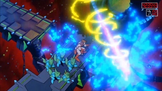 Like Dragon’s Lair, you have to repeat every major set piece and room once. But, unlike Dragon’s Lair, instead of mixing up the order, in Space Ace (at least on the highest difficulty setting), every sequence that repeats is done back-to-back. You play a room once, and then the screen goes black for a split-second and then it just repeats, only mirrored. It’s so lazy and jarring and it takes the wind right out of Space Ace’s sails. I cringed every single time it happened. Honestly, in Dragon’s Lair, I came to appreciate the mirrored levels. “Alright, I’ve done this room! What was the order?” I’d ask myself. That excitement wasn’t there for Space Ace because I literally just did this section. And, unlike Dragon’s Lair, which is set in a castle that would have many rooms, in Space Ace the narrative doesn’t lend itself at all to the repeating rooms. Not one bit. It’s Dexter running down an identical corridor, being caught in an identical plastic bag, energizing at the exact same moment with the exact same pose.. it’s just so badly done. Not even comically bad, but just sadly bad.