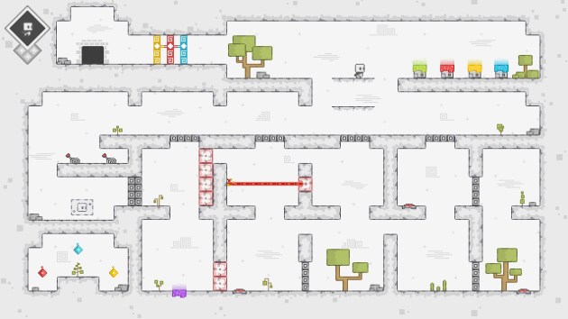 In the first few levels, you have to collect gems that open gates to the room exit. Then, Colored Effects adds a twist. Some of the levels require you to reach the exit once with each color available, at which point you come out the starting door and have to do it again as a different color. Once you’ve gone through the door in a color, it’s checked off, but you can’t go through the exit as that color again. It works and it’s unique, but these also tended to be the puzzles that were easiest because either the first move or the last move you’d make became too obvious. Oh, and if you’re curious what color blind mode looks like, here it is.
