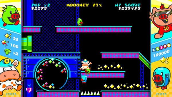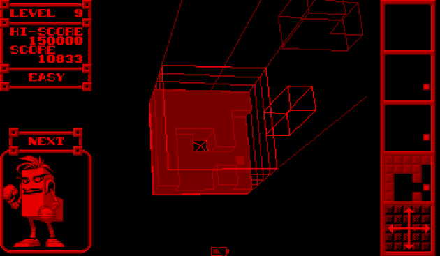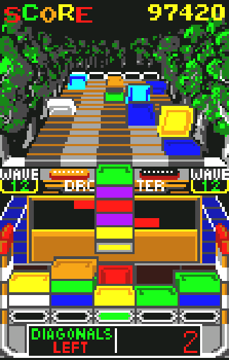 The first time I played Neo Breakout was the exact moment I couldn’t believe Atari didn’t sell the Reimagined games as their own collection. It runs neck-and-neck with Strikey Sisters as the best brick breaker I’ve ever played, and it does it without the aid of wacky power-ups. That alone is insanely impressive. Instead, the twists are mostly tied to the bricks themselves. The one that matters least to me is that you get bonus points by hitting identical colored bricks in a row. I just don’t have enough skill at aiming the ball to even think about utilizing that strategy deliberately. I will say that it’s really cool how the giant cube in the background changes colors to represent the active color you want to aim at in the chain. There’s also themed bricks. Some of them create new bricks if you hit them from the bottom, while another does the opposite and shatters bricks it shares a column with. There’s also crush bricks, which move in the opposite direction they’re struck and break any brick they run into. This includes the otherwise indestructible iron bricks. I’ll get to those in a little bit.