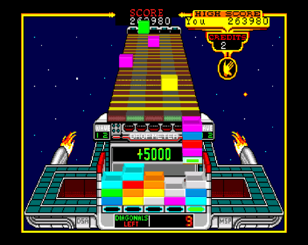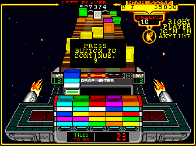 And I’m not even factoring the tethered mode into that statement. VCTR-SCTR can be played two ways: a single ship or two ships tethered. In the solo mode, the sequence of games is spot-on in terms of difficulty: Asteroids first, Lunar second, VCTR-SHMP third, and Tempest fourth. That sequence makes NO sense for the tethered mode, where Lunar Lander is easily the hardest of the four games. The green ship has no thruster. You have to land the dead weight on a separate platform. In the tethered mode, Lunar Lander should have been the fourth game in the sequence. No doubt about it.